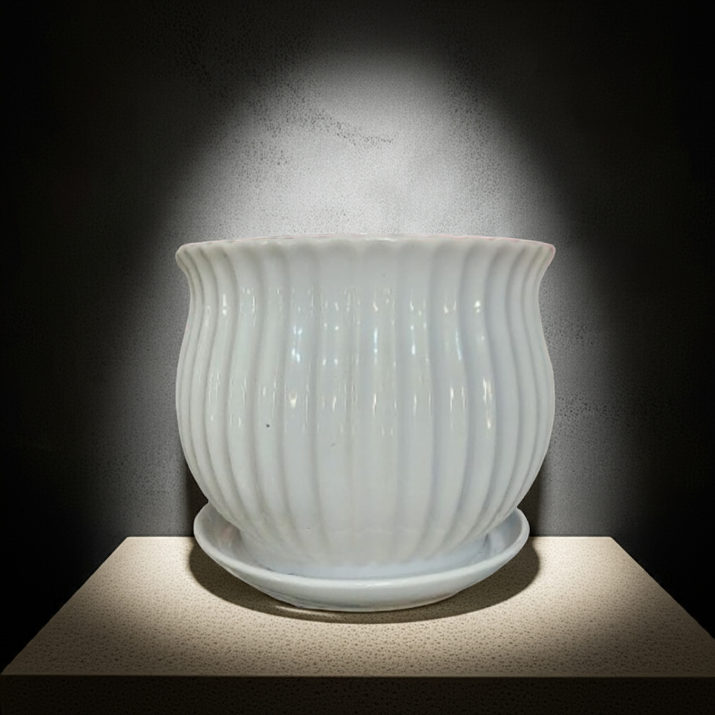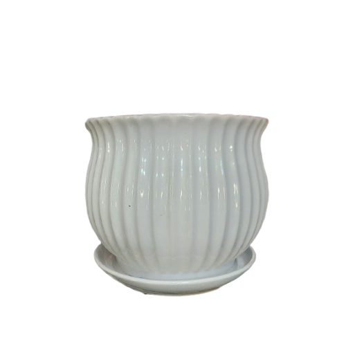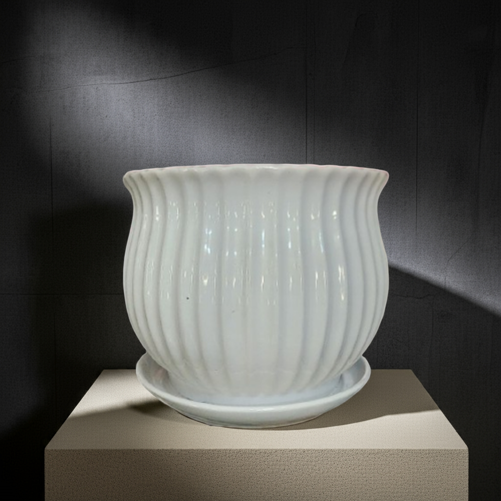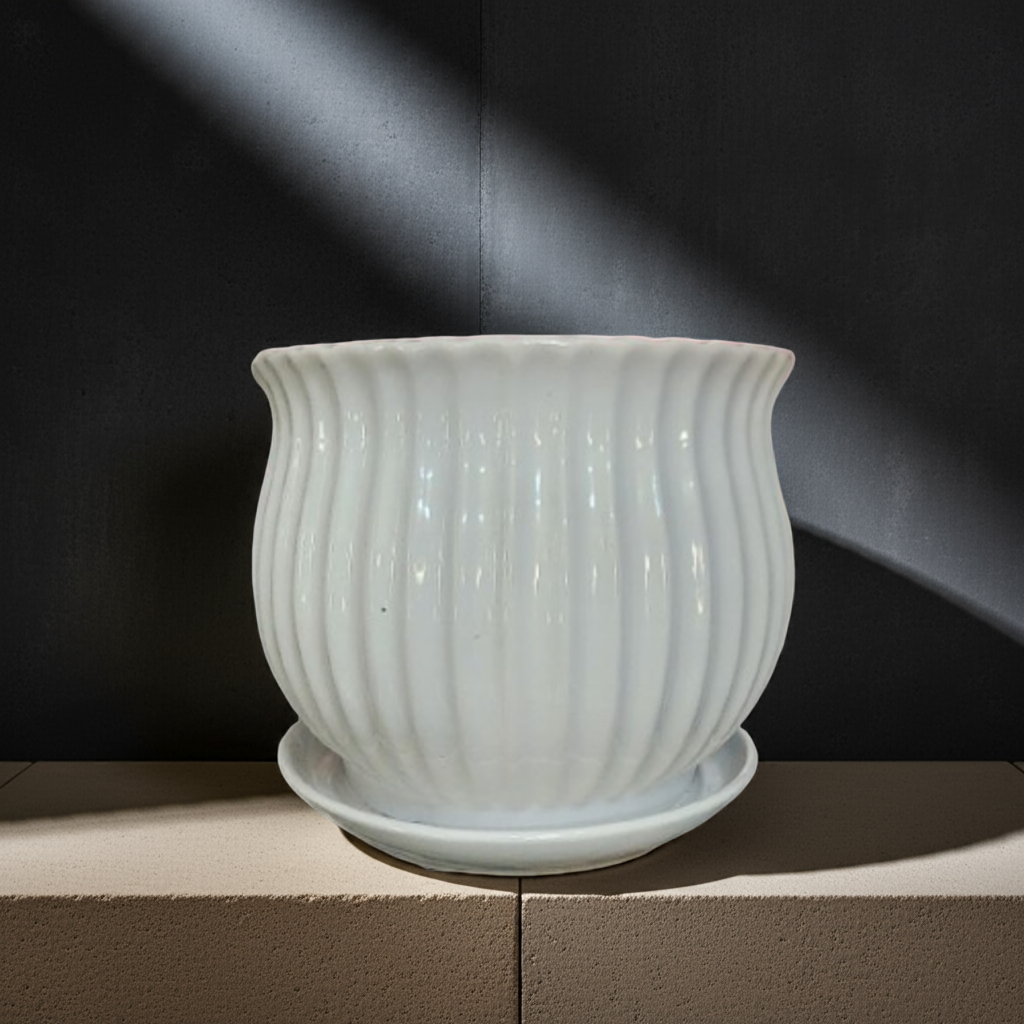 This classic white ceramic pot features a beautifully curved, ribbed design that exudes timeless elegance. Its glossy finish adds a touch of sophistication, making it a versatile choice for both traditional and modern interiors. The pot includes a matching saucer base for water drainage, ensuring it’s practical for indoor plant care.
